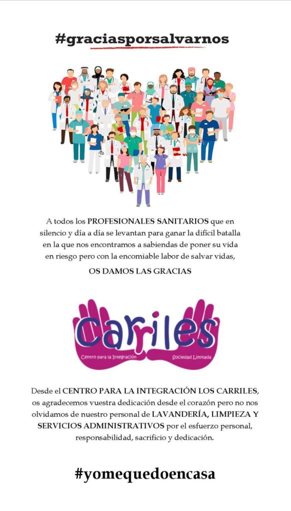 Desde el CENTRO PARA LA INTEGRACIÓN LOS CARRILES agradecemos a todo el personal sanitario la labor que está realizando en esta lucha en que nos hemos sumido contra el COVID-19, de la cual, estamos seguros que entre todos saldremos adelante y nos convertiremos en una sociedad más fuerte, unida y sobretodo concienciada y agradecida de lo que significa nuestro sistema de salud.